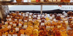 棚いっぱいにパッチワークのように並べられたパンは、惣菜パンやサンドイッチだけではない。菓子パン、デニッシュ、食事パンも揃う。まさにパンのパラダイスだ。