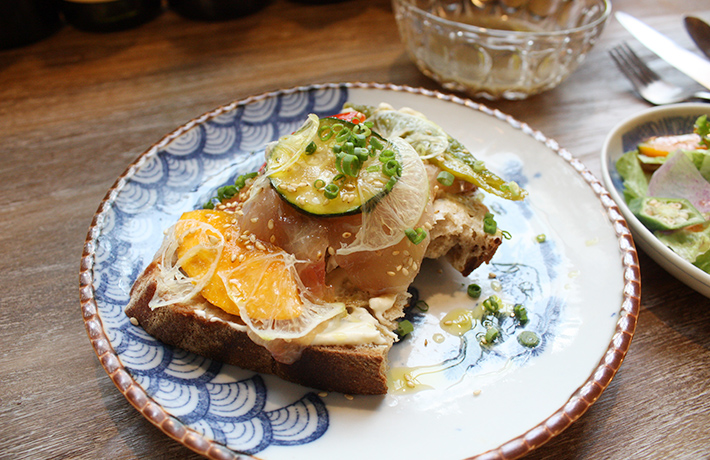 マネージャーの森下偉雄さんのおすすめは、「刺身のオープンサンド」。2018年5月のオープン以来、季節ごとに主役の魚を替えています。取材時はVer.6。シマアジをしょっつるとみりんで“づけ”にして、カボチャ、ズッキーニ、パプリカの煮びたし、豆腐サワークリームにライムを添えて。和食を思わせる繊細な素材の取り合わせ、ライムは爽やかな酸味と苦みが強く主張しすぎないようにと、皮を取り、レースのように透けるくらいの薄切りです。手切りでここまで薄く切るのは不可能ですが、なんと生ハムのスライサーを使っているのだそう。全粒粉生地ならではの奥行きの深い味わいのパンに、すべての食材が最善のバランスでコラージュされた美味。一皿の料理がブレッドの上に完結しています。