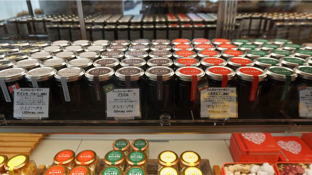 - 「メゾンジブレー」は、入り口の正面が生菓子のショーケースですが、左手にギフト菓子のショーケースがあり、4月頃から夏場は「フルフルジブレー」が主役ですね。様々なフルーツをはじめ、コーヒーゼリーも豆の産地別などのバリエーションを増やし、“旅するコーヒーゼリー”というコンセプトのアソートギフトが出来るほどになっています。