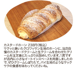 自慢のカスタードクリームを使った「カスタードホーン」は、注文後にクロワッサン生地のホーンにクリームをしぼっています。しぼりたてがいちばんおいしいですから、お客様には「どうぞ気軽にこの場でかぶりついて!」とおすすめしています。