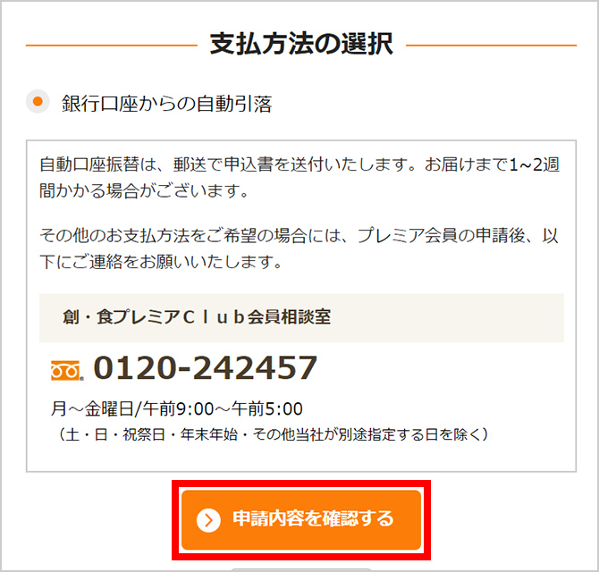 ※プレミア会員の承認には銀行口座等の審査があります。創・食Clubの承認審査は、申請者の方から自動引落用紙をご返送いただいてから、10日ほどのお時間をいただいております。なお、承認の連絡はメールで行います。