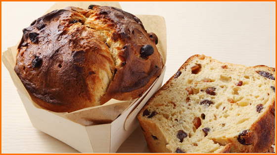 リスドオルをじっくり発酵させ、中種として使用。本練りにもワインと牛乳を使用しました。しっとりと風味豊かな生地と、ラム酒やオレンジキュラソーに一週間漬け込んだドライフルーツがベストマッチ、パネトーネ風のリッチなパンです。この美味しさ一度食べたら病み付きになります。2日間ぐらい置いた方がしっとり馴染みます。