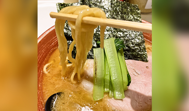 家系ならではの中太麺だが、北海道産小麦の「春よ恋」「ゆめちから」に、熊本県産のもち小麦「モチハルカ」をブレンドした特注麺。モチッと滑らかな食感が、口の中に心地よい食感を残してくれる。