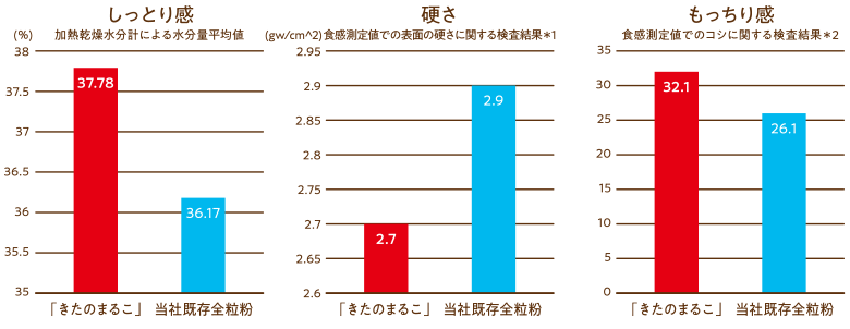 「きたのまるこ」は、当社既存全粒粉よりも、しっとり、ふんわり、もっちりした食感に。