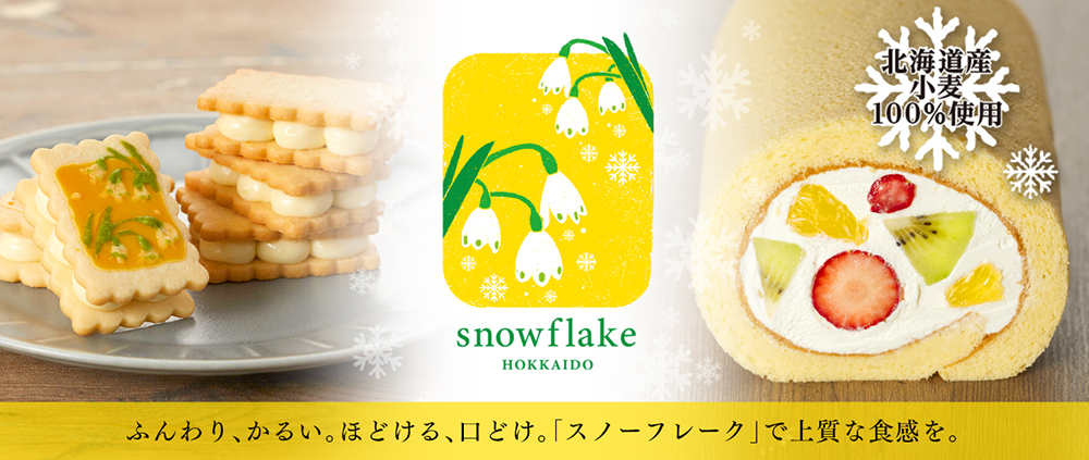 北海道産小麦の菓子用粉「スノーフレーク」を使用したふんわり、しっとりとした食感のロールケーキです。程よく軽く、しっとりした口どけの良い生地を、フルーツやクリームとバランスが良いロールケーキに仕上げました。