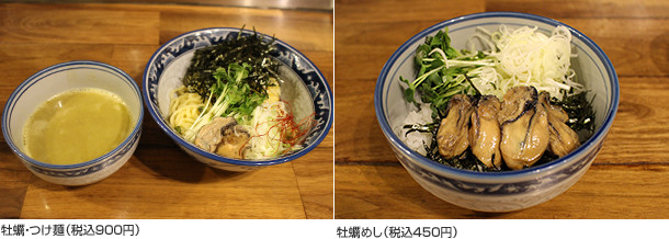 看板メニューの「牡蠣・拉麺」以外にも、「牡蠣・つけ麺」や「牡蠣めし」、さらには「生牡蠣」まで提供。牡蠣の旨味をさまざまな角度から味わえます。