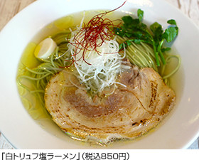 看板メニューは「白トリュフ塩ラーメン」。青森の高級地鶏・大鰐シャモロックの丸鶏をふんだんに使い、アクセントにイタリア・アルバ産の白トリュフでつくった自家製香味油が香る一品。ラーメンでトリュフを使った元祖といわれています。