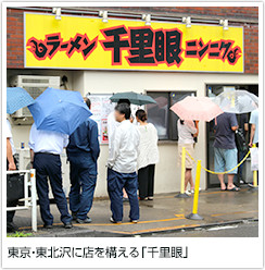 小田急線東北沢駅から徒歩8分、東大駒場キャンパスの隣に店を構える「千里眼」。「お客様にお腹いっぱいになって帰ってもらう」というコンセプトのもと、濃厚でボリュームたっぷりのラーメンを提供。開店1時間前から行列ができ始めるほどの人気店です。