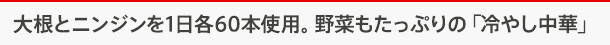 「大根やニンジンは食欲を増進する作用があるといいますので、夏場にもってこいの食材です。1日あたり、それぞれ60本くらい使っているので、仕込みがもう大変(笑)。当店は、麺の量が普通盛りでも一般的な店の倍近くあると思いますが、さっぱりした生野菜と合わせることで、最後まで飽きることなく召しあがっていただけるんじゃないでしょうか」