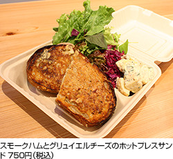 「スモークハムとグリュイエルチーズのホットプレスサンド」に使っているパンは、「サワードウ」です。フランス式に言えばカンパーニュで、ルヴァン種を使い、小麦粉は北米産の強力粉とフランス産全粒粉にスペルト小麦をブレンド。具をはさんでからグリルすることで、表面がカリカリッと芳ばしく、ほのかに感じられる酸味がチーズにもよく合います。同じパンを使った「マッシュルームとゴーダチーズのホットプレスサンド」もあります。