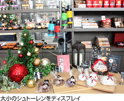 シュトーレンは、お客様が購入後、時間をかけて食べることを考えて、店内でも冷蔵ケースで販売しています。そのため、ちょっと目立ちにくさはありますが、店先の黒板や店内POPで誘導。近くにクッキーやガレット・ブルトンヌなどの焼き菓子類とクリスマス用のプチギフトボックスを並べて、クリスマスを迎える楽しい雰囲気のコーナーをつくっています。