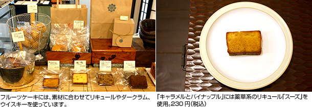 焼き菓子のコーナーには、トンカ豆のほかにもローズ、柚子、アールグレイなど、香りを楽しむ焼き菓子が並んでいます。「ケークオショコラ」には洋酒のグランマルニエ、「ケークオフリュイ」はドライフルーツをキルシュに漬け込み、シナモン、スターアニス、胡椒、山椒などスパイスを10種類以上使用しています。