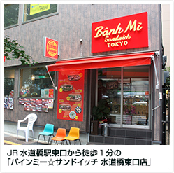 高田馬場にある人気店「バインミー☆サンドイッチ」の2号店。白山通りを挟んでJR水道橋駅東口の目の前に2018年6月にオープンしました。店内にはイートイン8席を備え、自家製パンを使ったバインミーのほか、生春巻き、フォーなどの麺やごはんもの、アボカドシェイク(シントー)など本店にはないメニューも提供しています。