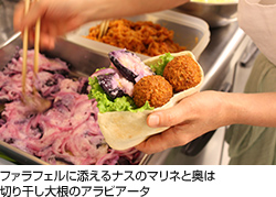 ファラフェルサンドのひよこ豆のコロッケと一緒にはさんであるのは、切り干し大根のアラビアータと、半日干して揚げたナスを玉ねぎドレッシングでマリネしたもの。ヨーグルトと塩にんにくのソースでまとめています。