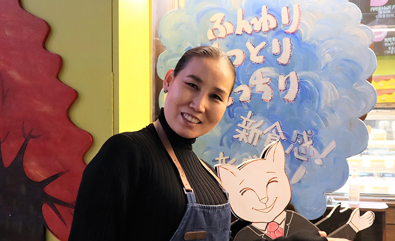 卵色のイメージカラーに猫のマスコットキャラクターなどで楽しくディスプレイされたお店に入ると、ショーケースにはカットした新カステラがずらりと並んでいます。その横には隣の工房で焼きあげた、カット前の大きなカステラがスタンバイして、なかなか迫力のあるサイズです。台湾発のカステラ菓子を初めて日本に紹介したのは、店長のミさんです。