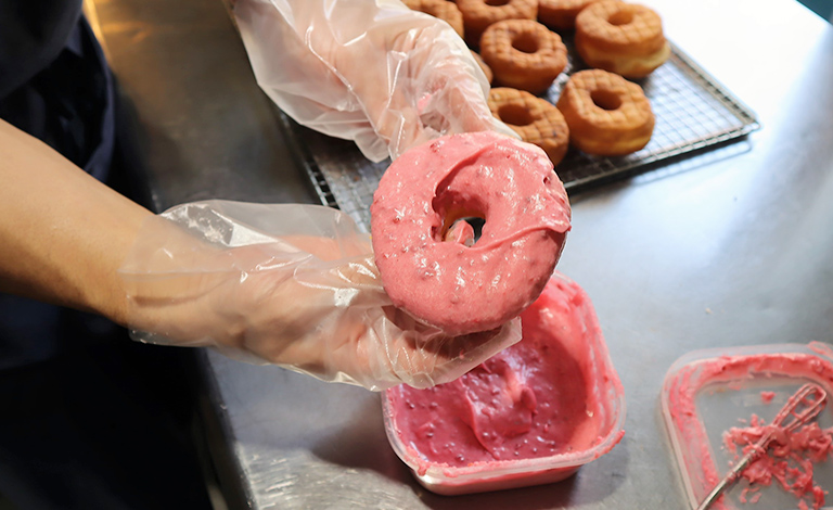 こだわりのドーナツに、さらにおいしさや彩りを加えるのが、さまざまなグレーズやカスタードクリームなどのフィリングです。