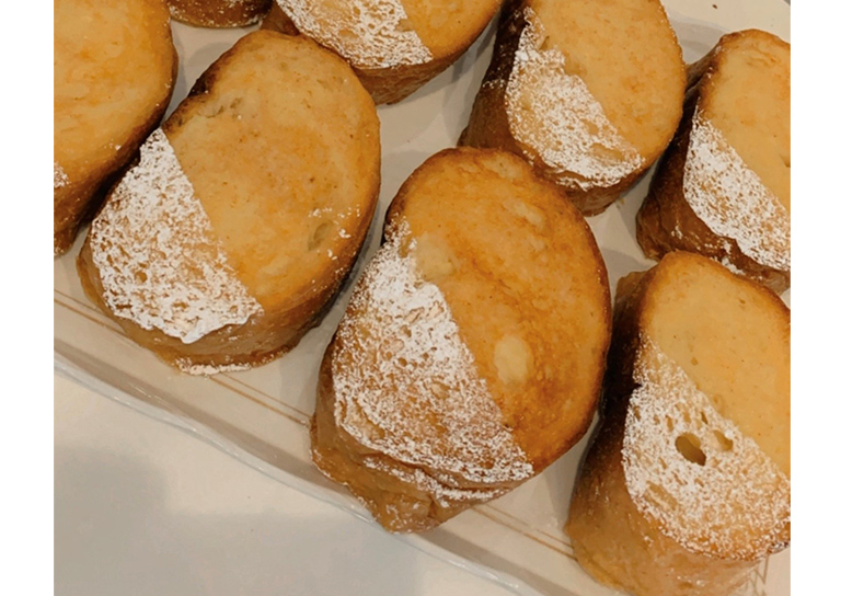 デザート系の人気アイテムは、パンドミのフレンチトースト。スライスしたパンドミに生クリームを使用したアパレイユをたっぷりと含ませて、オーブンで10分弱焼きあげています。ずっしりと重みがあり、トロトロのプリンのよう。パンの中心には敢えてアパレイユを浸み込ませずに、パンそのもののおいしさも味わっていただけるようにしています。少し温めてからいただいてもよいですし、夏はアイスをのせるのもおすすめです。