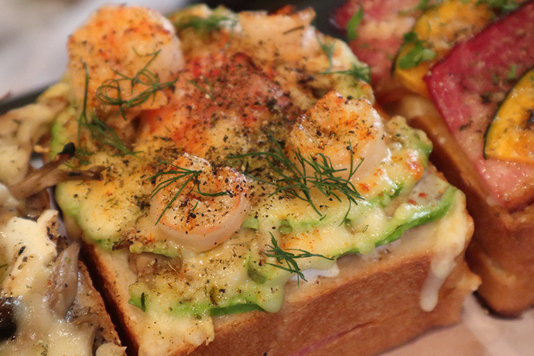 食パンでつくるクロックムッシュは「ツナ、レンコン、ハム」「ベーコン、カボチャ、カレー」、目玉焼き入りのクロックマダムは「エビ、アボカド、ハム」「きのこ、ハム、マッシュルームソース」と、取材時には4種類をラインアップ。贅沢に厚切りにした食パンの間には、ベシャメルソースとハム(「かぼちゃ、ベーコン」はベーコン)をはさんでいます。