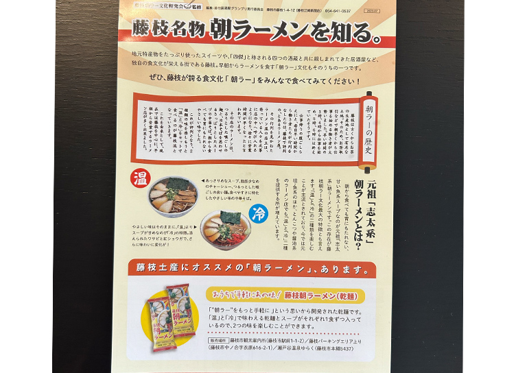 静岡県の藤枝市には、早朝からラーメンを食べる「朝ラー」文化があります。福島県の喜多方などにも朝ラー文化はありますが、「温」と「冷」の二種類のラーメンをセットで食べるのが藤枝流。朝から食べても胃にもたれない、「元祖・志太系」と呼ばれる甘みを感じる魚系スープが特長です。