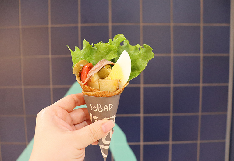 「『こんなクレープ、食べたことがない!』と驚きの声をたくさんいただくのは、惣菜系のソバープなんです。たとえば、私が大好きな『ニース風サラダ』は、アンチョビ、ゆで卵、トマト、レタス、オリーブ、ジャガイモがトッピングされています。一口食べた瞬間、右の頬と左の頬で異なる味がスパークして……初めて食べたときは、私も感動しました」(小原さん)