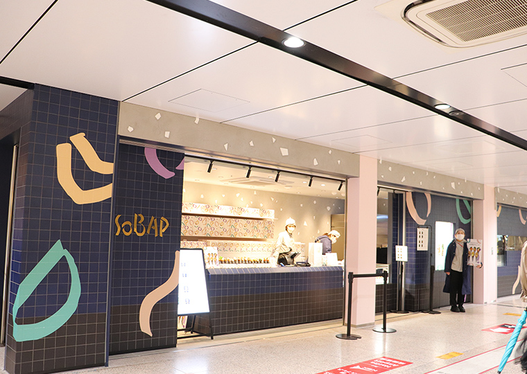 たくさんの人が行き交う東京駅改札内のエリアで、一際目を引くブルーの壁。ショーケースを覗くと、エディブルフラワーや、フリルのようなケールをまとったソバープなど、たくさんの種類のソバープが並んでいます。