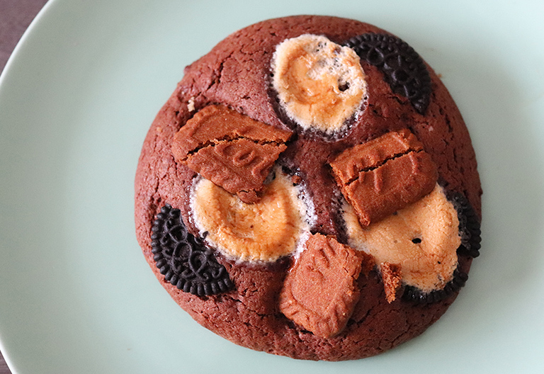 「チョコ風味のクッキーに、むちっとした食感のマシュマロが3個と、カラメルビスケットを1.5枚、ココアビスケットを1.5枚トッピングしています。言い換えると、クッキーの上に、さらに合計3枚の別のクッキーがのっているということです」(畑下さん)