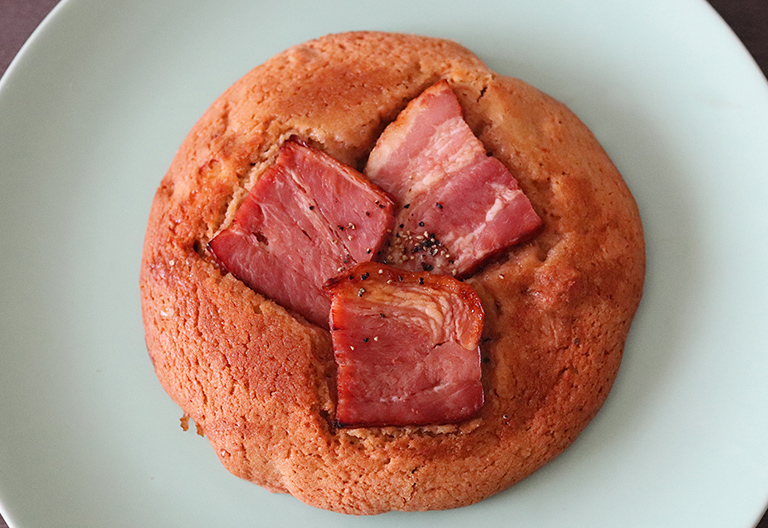 「こちらは、クッキーに厚切りベーコンと、ブラックペッパー、クルミ、メイプルシロップを合わせた商品です。メイプルとベーコンを同時に食べたときの甘塩っぱい味わいがたまらないので、ぜひ一度試していただきたいです。ちなみに、ベーコンは約50グラムのせています。当店のクッキーはどれも具材がたっぷりで、オーブンで焼き上げる前は、具材でクッキー生地が見えないほどなんですよ」(畑下さん)