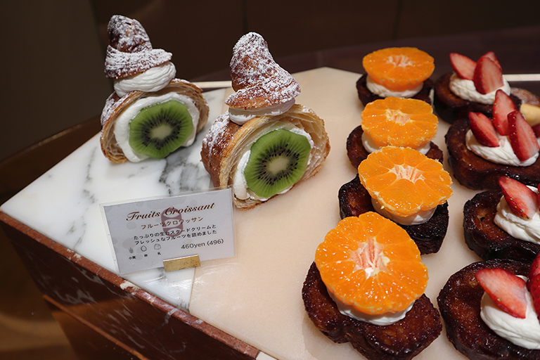 半分にカットしたクロワッサンの中にフルーツとクリームを詰めた「フルーツクロワッサン」は、先端部分をちょこんとトップに載せて、これもインパクトのあるビジュアルです。