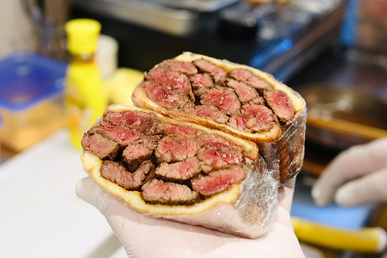 たとえば、人気ナンバーワンの「ミートボックス」には、ジューシーな肉質が特徴のサガリのステーキが300グラムサンドされています。女性に人気の「オムボックス」は、卵が6個分使用されているのだとか。松本さんは「“身の丈”に合ったサンドイッチをつくっただけですよ」と、自身のお腹をさすりながら笑います。
