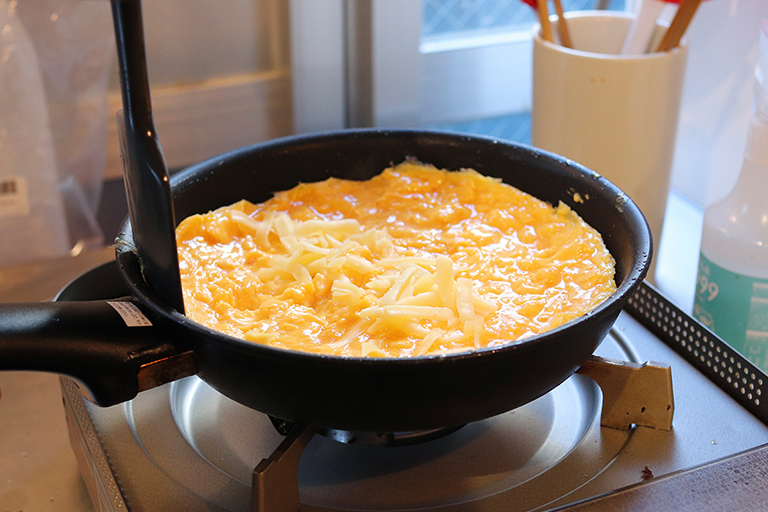 「オムボックス」は組み立て方に工夫を施しました。バターと特製マスタードマヨソースを塗ったパンにハムを重ね、その上にチェダーチーズを散りばめて焦げ目をつけます。マーブルチーズを中に閉じこめた卵6個分のオムレツをパンにのせ、カットしたら表面に胡椒とパセリをふりかけます。卵だけだと単調になりがちなところを、風味の異なる2種のチーズを使用することで、アクセントを加えました。具材を立たせるため、パンはあっさりとした味わいのものを選び、サンドイッチに仕上げる直前に表面をあぶって香ばしさをプラスしているそう。