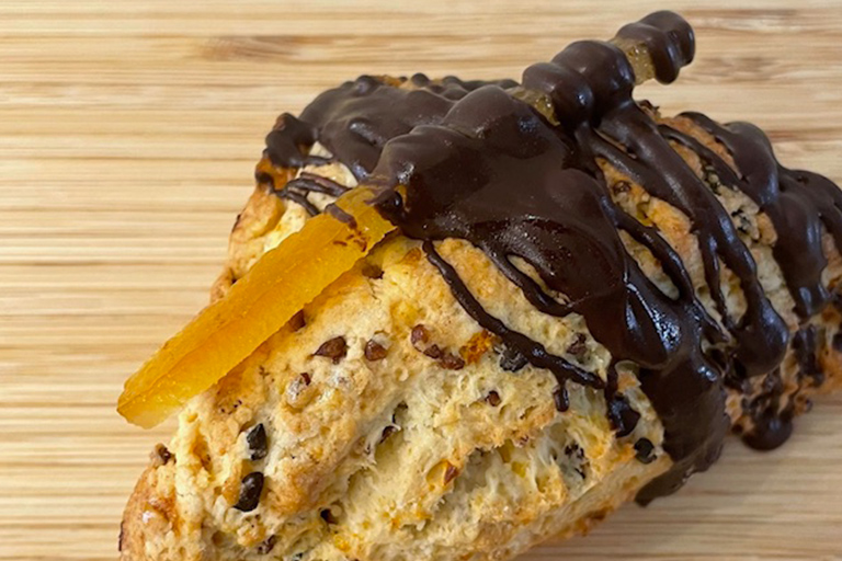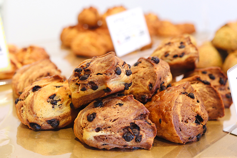 現在、もっとも人気なのはプレーン生地とカカオ風味の生地を織り交ぜたマーブルチョコスコーンです。カカオ生地にはバンホーテン社のココアを配合し、頬張ると口の中いっぱいに豊かなカカオの香りが広がります。最後にチョコチップも加え、カリカリとした食感もプラスされています。