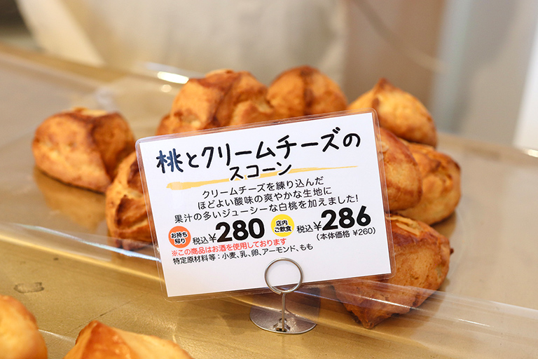 「季節限定の『桃とクリームチーズのスコーン』も、生地に桃のピューレをふんだんに使用しているため、生クリームの量を減らしています。この商品は特に、ひとまとめにするのに苦労します。当店のスコーンは、最終的に焼く前の生地はほっぺたくらいの固さになるのですが、桃とクリームチーズのスコーンはだれやすいので、オーブンの一番上でなるべく短時間で焼き上げます」