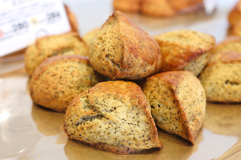 「スコーンそれぞれが違う粉のバランスでできています。小麦粉100%でつくるものもありますが、それはむしろ少数派です。粉の種類によって、サクサク、しっとり、ほろほろと食感がまったく異なるので、食べ比べても楽しいと思います」