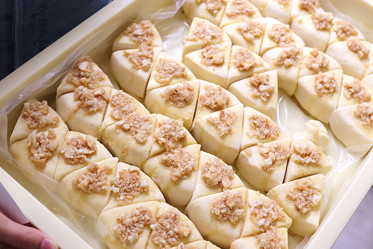 一方で配合はフレーバーによってさまざまです。たとえば、はちみつバタースコーンは生地の生クリームの配合を減らし、はちみつの風味を引き立てています。生地にはコーングリッツとハニーバターソースを加え、さらに焼成時にはちみつを絡めたパン粉をふりかけて焼き上げます。