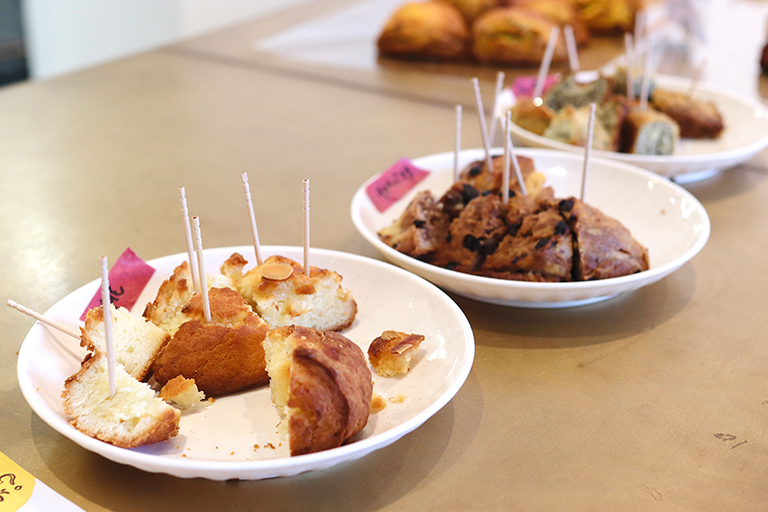 店内にはスコーンの試食も用意しています。お客様からは「これまでに食べたことのない食感」「こんなスコーン初めて」といった驚きの反応もあるそうです。