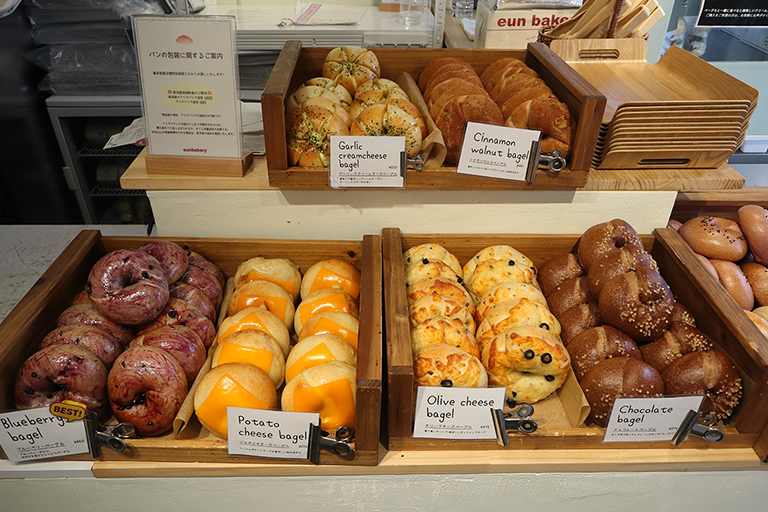 商店街に面したテイクアウト専門の同店。天気のよい日はテラス窓を開放して、明るい店内のカウンターにベーグルの数々が並びます。韓国式のベーグルにはどんな特長があるのでしょう。マネージャーの竹内里恵さんにお話を伺いました。