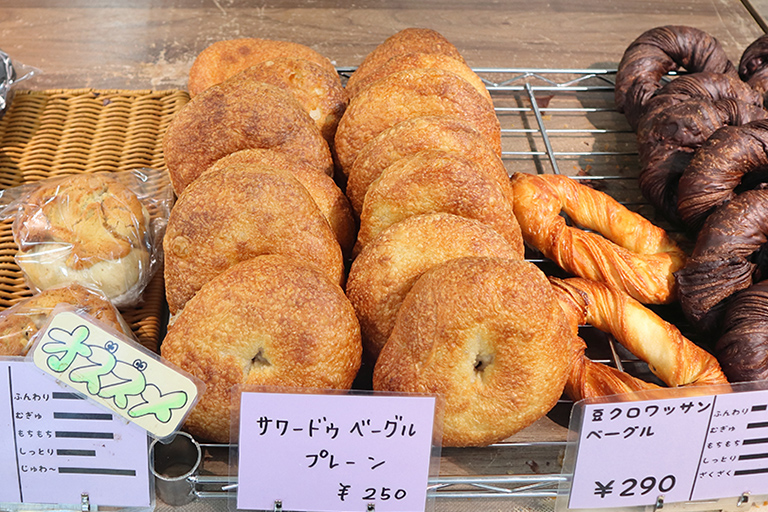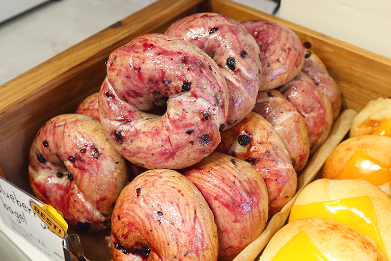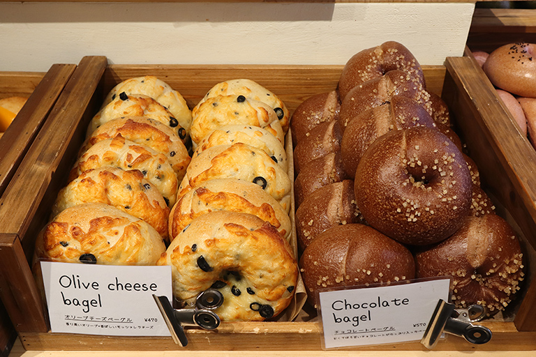 売場に並ぶベーグルは9~10種類。シンプルな「プレーン」のほか、プレーンの生地にブルーベリーやオリーブ、くるみなどの素材を練り込んだフィリングなしのベーグルは、生地そのものの香ばしさともちもちとした食感を最大限に生かすようにつくられています。