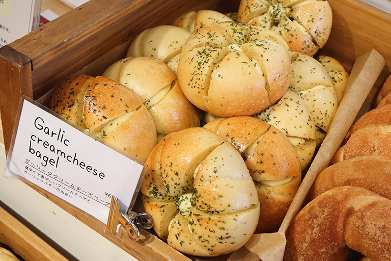 焼き上げたベーグルに放射状に切り込みを入れて、断面にガーリックバターを塗り、ガーリック風味のクリームチーズを絞り入れています。表面にはシロップを塗って艶やかさと甘みをプラス。Kベーグルならではの、ガーリックの香ばしさと甘じょっぱさのバランスがよく、クセになる味わいです。