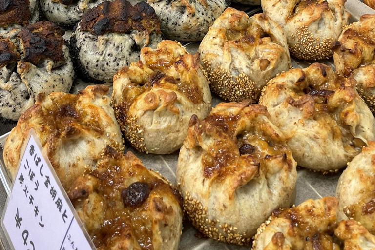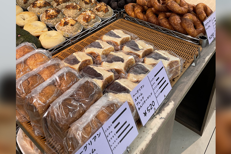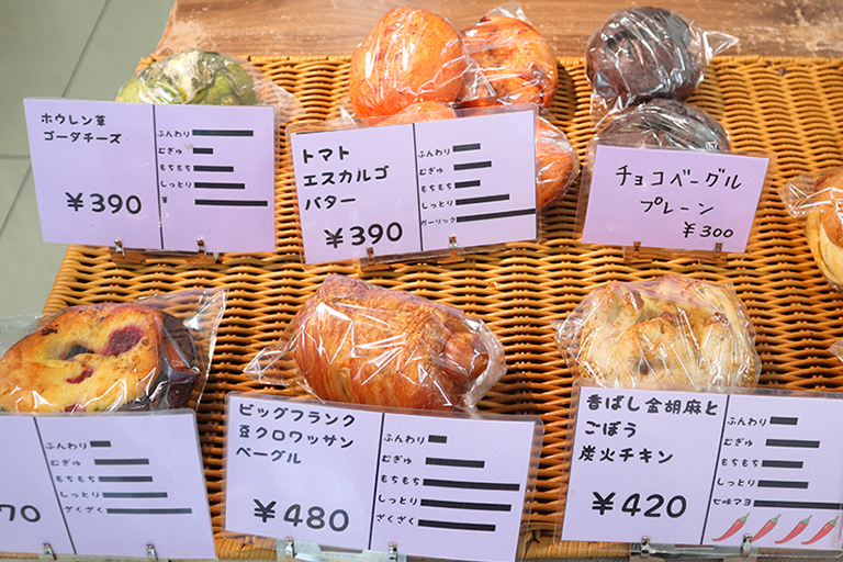 このほか、アールグレイ生地、抹茶生地、チョコレート生地、トマトやほうれん草などの野菜系の生地など、それぞれ粉の配合から変えているそう。おかず系の具材を包んだ惣菜ベーグル、甘いフィリングを包み、ダマンド生地をかぶせて焼き上げたアイテムなど、バリエーションは多彩です。