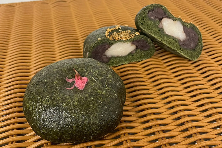 よもぎを練り込んだ生地にあんことおもちを巻き込んだ「よもぎもちベーグルあんパン」は、しっとりと吸いつくような生地のもち感が際立ったベーグル。コンベクションオーブンでスチームをかけながら蒸し焼きし、焼き上がりの熱々のまま急速冷凍庫に入れて、表面を一瞬で凍らせることで、中に水分や香りを閉じ込めているそう。