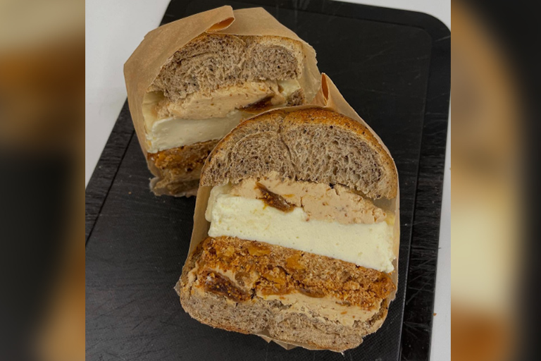 自家製のチーズケーキやクッキーなどをはじめ、さまざまな具材の組み合わせを楽しめるスイーツ系のサンドも好評です。例えば「アールグレイフィグノアレアチーズケーキベーグルサンド」は、やわらかな食感のアールグレイベーグルに、赤ワインに漬けたドライいちじく入りのクリームチーズ、全粒粉入りくるみのクッキー、レアチーズケーキをサンドした、ほかにはないべーグルサンドです。