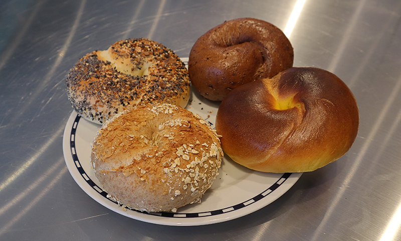 小麦粉とライ麦粉にキャラウェイシードを合わせた黒い色のベーグルは「プンパニッケル」。生地に卵を練り込んで、軽めで少し甘みのある「エッグ」とともに、NYではポピュラーなベーグルです。