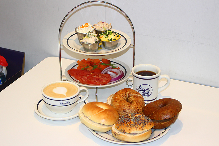 土日祝日限定で登場するのが「ベーグル&アペタイザーセット」です。お好みのベーグル4個と、スモークサーモン、フレッシュ野菜、スプレッド4種を2段のスタンドにセット。ドリンク2杯付きで、2~3人で楽しむことができます。