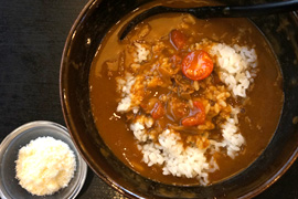 尾藤店主が「牛かれーうどん」で最も重視したのは「ダシ感の強いスープ」です。ピリッとしたカレーの辛さと共に、ダシがしっかり味わえるスープは、トロみが強くコシの強い太いうどんによく絡みます。具は牛肉と玉ねぎがたっぷりで、スパイシーなカレースープに鰹節、昆布、いりこのダシが絶妙のバランスで絡みます。辛さは中辛の「レギュラー」と辛口の「ホット」があります。 「牛かれーうどん」は、生玉子、温泉玉子、チーズ、もち、トマト、エビフライ、揚げなす、つけめん(うどん)などバリエーションが豊かです。また、コーンやサクサクたぬきなどのトッピングも出来ます。 カットしたプチトマトがトッピングされた「トマト牛かれーうどん」は、好みで粉チーズをかけて食べます。また、うどんを食べて残ったカレースープにご飯を入れて、リゾット風にして食べる事が出来ます。