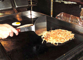 独創性の高い同店のラーメン「焼麺」(750円)は、こうした星さんの強い意志のもと誕生しました。 「焼麺」に使う麺は、断面の四角い超極太麺。これを約1分間茹でた後、鉄板で4~5分間蒸し焼きにすることで、香ばしくカリッとした部分ともちもち感が同時に楽しめる麺に仕上がるのです。 「修行先でまかないを担当していたとき、焼き麺のおいしさに出合いました。この焼き麺にベストなスープが、まだマニアなど一部でしか話題になっていなかったベジポタだったんです」(星さん) 焼き麺とベジポタスープという、目新しさのあるもの同士が組合わさることで、「わざわざ来てもらえるような店」の独創性の高い味が完成したのです。 同店のベジポタスープは、チャーシューのうま味が溶け込んだ醤油ダレ、豚骨スープ、ジャガイモやタマネギで作ったスープの3つを合わせて作られます。 「スープは、飲むというより食べるような感覚で、口に運んでもらいたいですね。濃度の濃いベジポタなら麺によく絡みます。さらに、麺の焼けたバリバリとした部分には、スープが染み込むようにして絡みます」(星さん) 「焼麺」には、ネギとシナチクのほかにチャーシューと目玉焼きをトッピング。チャーシューと目玉焼きは、麺を焼く際一緒に鉄板で焼き上げます。チャーシューはカリッと香ばしく、目玉焼きは鉄板の温度の低い部分で焼き上げて白身はふっくらと、黄身はとろりと半熟に仕上げます。さらに削りたての鰹節を別添えします。 「黄身を溶かすとよりまろやかになりますし、鰹節を入れるとまた違う風味になります。途中で味を変えて、最後まで飽きずに味わってもらえればと思っています」(星さん) 卓上には紅ショウガも用意。入れるとさっぱりとして、味の変化を楽しむのに最適なアイテムです。 ● 家族連れや外国人にも人気