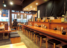 「学生も多い立地ですが、当店のお客様は、少し高くてもおいしいものを食べたいという会社員の方が主なお客様です。揚げたてのごぼうの天ぷらは、ハーフサイズもご用意しており、女性のお客様にも好評です」(林田真一店長) 「ごぼうおろし」は、別添えのたれを食べる直前にかけて食べるぶっかけうどんです。 「豊前うどんの一番の特徴は、麺です。細麺で、稲庭うどんより少し太いくらいです。店舗内で製麺した後2時間以上熟成させます。そして茹で上げ後、冷水でしめることで、しっかりとしたコシと、つるっとしたのど越しの麺に仕上がります。かけより、ぶっかけの方が、こうした麺の特徴を感じてもらいやすいと思います」(福島さん) 「ごぼうおろし」のたれや、「ごぼう天」(850円)などのかけうどんに使用するつゆの出汁は、北海道産の羅臼昆布をベースに、数種類の魚介系から取っています。この出汁に、九州の醤油を合わせ、甘めに仕上げています。 同店には、かけ、ぶっかけ、ざる、釜揚げのほか、創作うどんとして、「明太子クリーム」(880円)や「坦々うどん」(900円)といった従来のうどんのイメージにないメニューもあります。 「『明太子クリーム』は、生クリームと出汁を合わせたスープで、トッピングに辛子明太子と海苔、ネギをたっぷりトッピングしています。女性のお客様に人気があります」(林田店長) また、トッピングの天ぷらにその時々の旬野菜を使用するなど、季節限定メニューの開発にも余念がなく、常連客を飽きさせない店づくりに励んでいます。 |
