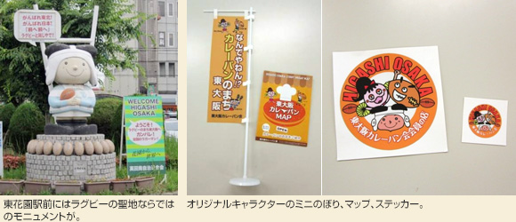 平成20年、市役所の若手職員から提案され、「ラグビーのまち東大阪」をイメージさせる食ブランドとして「カレーパン」での町おこしが始まりました。カレーパンがラグビーボールの形に似ているということと、かつてカレーで有名なハウス食品のカレー工場があり、カレーの香りが漂う町だったことから、カレーパンが選ばれました。