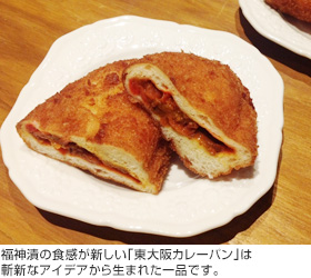 「カレーと言えば福神漬!と閃いたんです。独特の酸味とコリッとした食感も楽しめるカレーパンに仕上がりました」と太鼓判を押します。できあがった「東大阪カレーパン」はまさにカレーライスがパンに仕上がった感覚で、口の中で今までにない食感と風味が広がります。ラグビーボールの形で、揚げタイプのカレーパンは生地はもっちり、中の具材である福神漬の食感とも相性がよく仕上がっています。「驚きのあるパンにしたかったんです。食感の楽しさが狙いです」と高田さんは言います。