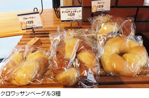 人気のクロワッサンベーグルブルーベリー(220円)を食べてみると、外側のクロワッサン生地がサックリ、中がしっとりもっちりしていて、その食感がたまりません。軽くトーストするとブルーベリーの甘酸っぱい香りと共に、よりサックリ感と中のふっくらモチモチ感が増し、その対比がおもしろい。「クロワッサン生地を合せることで、よりしっとり感や柔らかさが増し食べやすくなりました。結果、お客様の層が広がりました」(広報)。ベーグルとクロワッサン、双方の魅力を存分に引き出した、ベーグル専門店ならではのクロワッサンベーグルは一度食べたら止められません。