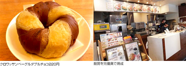 さてそのクロワッサンベーグルを求めて千代田区の神保町店に伺いました。靖国通りに面した店内には、お馴染みのベーグル約20種とマフィンがズラリ。そしてありました!中央の目立つところにクロワッサンベーグルが3種類。種類はプレーン(210円)と、ブルーベリー(220円)とダブルチョコ(220円)の3種。「ブルーベリーが一番人気です」と答えてくれたのは、入社9年というベテランの村山正貴店長。その優しい笑顔に常連客も多いようです。ここは厨房を完備、ベーグルは勿論、クロワッサンベーグルも毎日焼成。「日々ブレのない商品をきっちり焼いてお客様に喜んでいただくのが私の仕事」と村山店長。